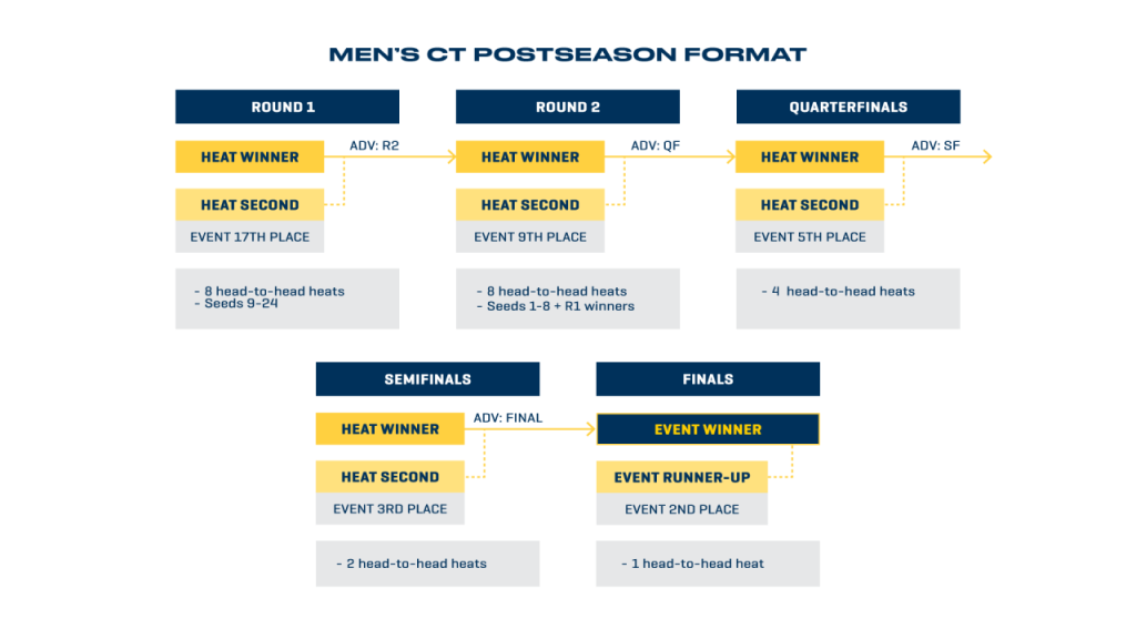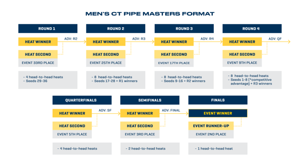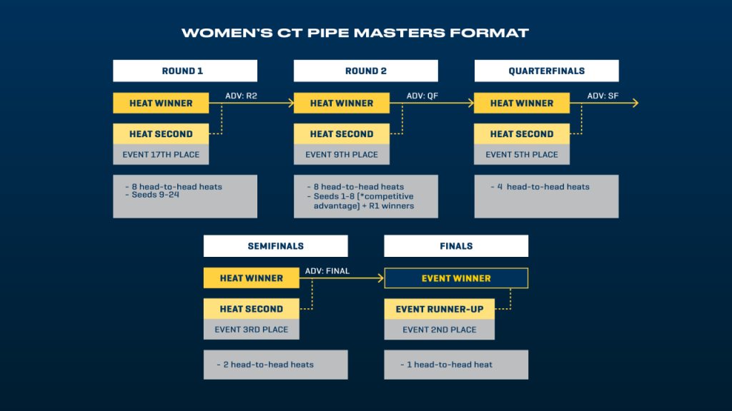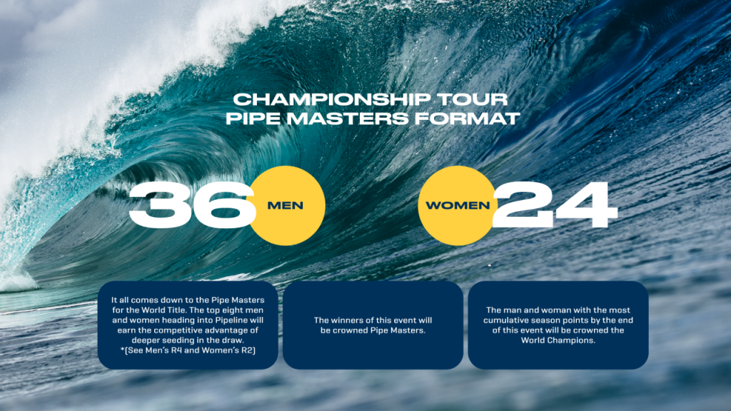 La temporada finalizará en Pipeline, donde competirán las plantillas completas de hombres y mujeres desde el inicio de la temporada. Este evento final, el Pipe Masters, tendrá un valor añadido con 15.000 puntos en juego, un 50 % más que un evento estándar. Los ocho mejores surfistas de ambas divisiones que lleguen a Pipeline recibirán una clasificación avanzada, lo que creará un final de alto riesgo para determinar a los Campeones del Mundo.