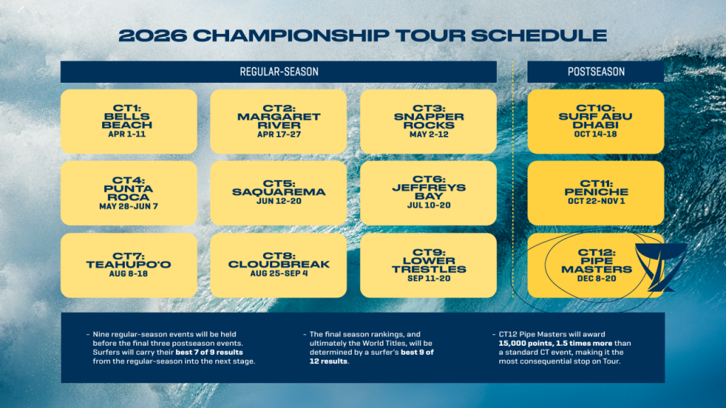 El Championship Tour 2026 durará nueve meses y visitará nueve países, con 12 eventos programados. El programa incluye una variedad de tipos de olas, desde rompientes de arrecife con tubos como Pipeline, Cloudbreak y Teahupo’o hasta lugares de alto rendimiento como Lower Trestles, Punta Roca y Abu Dabi. El programa también incluye paradas conocidas como Snapper Rocks, Jeffreys Bay, Margaret River, Portugal, Saquarema y su apertura en Bells Beach.