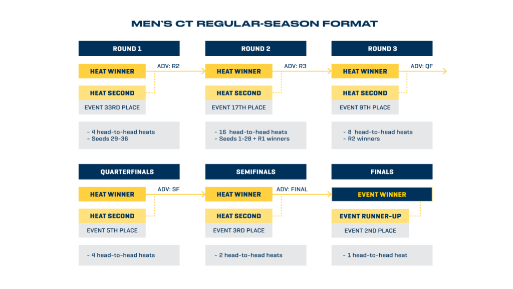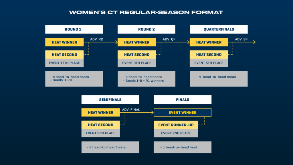 Los eventos de la temporada regular (paradas 1 a 9) contarán con 36 hombres y 24 mujeres. La categoría masculina estará compuesta por 32 surfistas clasificados, dos wildcards de temporada y dos wildcards de evento. La categoría femenina incluirá 21 surfistas clasificados, dos wildcards de temporada y una wildcard de evento.